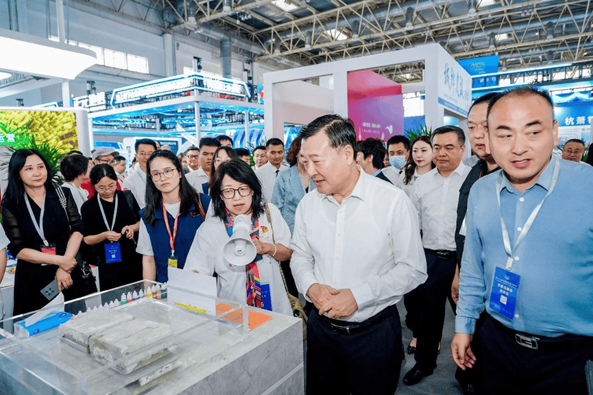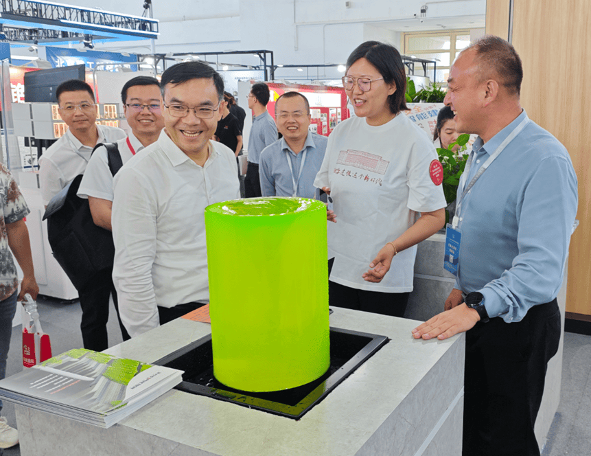 姜萬榮副部長參觀澎內(nèi)傳展臺,邊聽講解、邊認(rèn)真觀看水池池壁裂縫自愈合實際應(yīng)用效果。